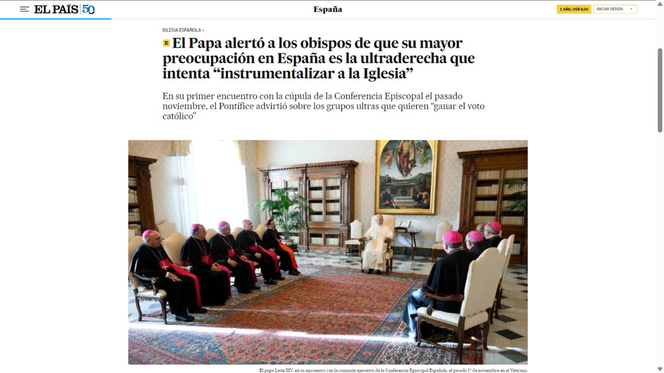 El diario socialista español El País publicó este 23 de febrero un titular tan explosivo como conveniente: el Papa León XIV habría alertado a los obispos españoles de que su “mayor preocupación en España es la ultraderecha que intenta instrumentalizar a la Iglesia”.