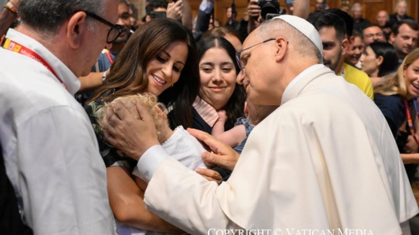 Durante el encuentro con los influencers, el Papa León bendice al hijo de Lila Rose, una de las influencers pro vida más importantes de Estados Unidos. Foto: Vatican Media