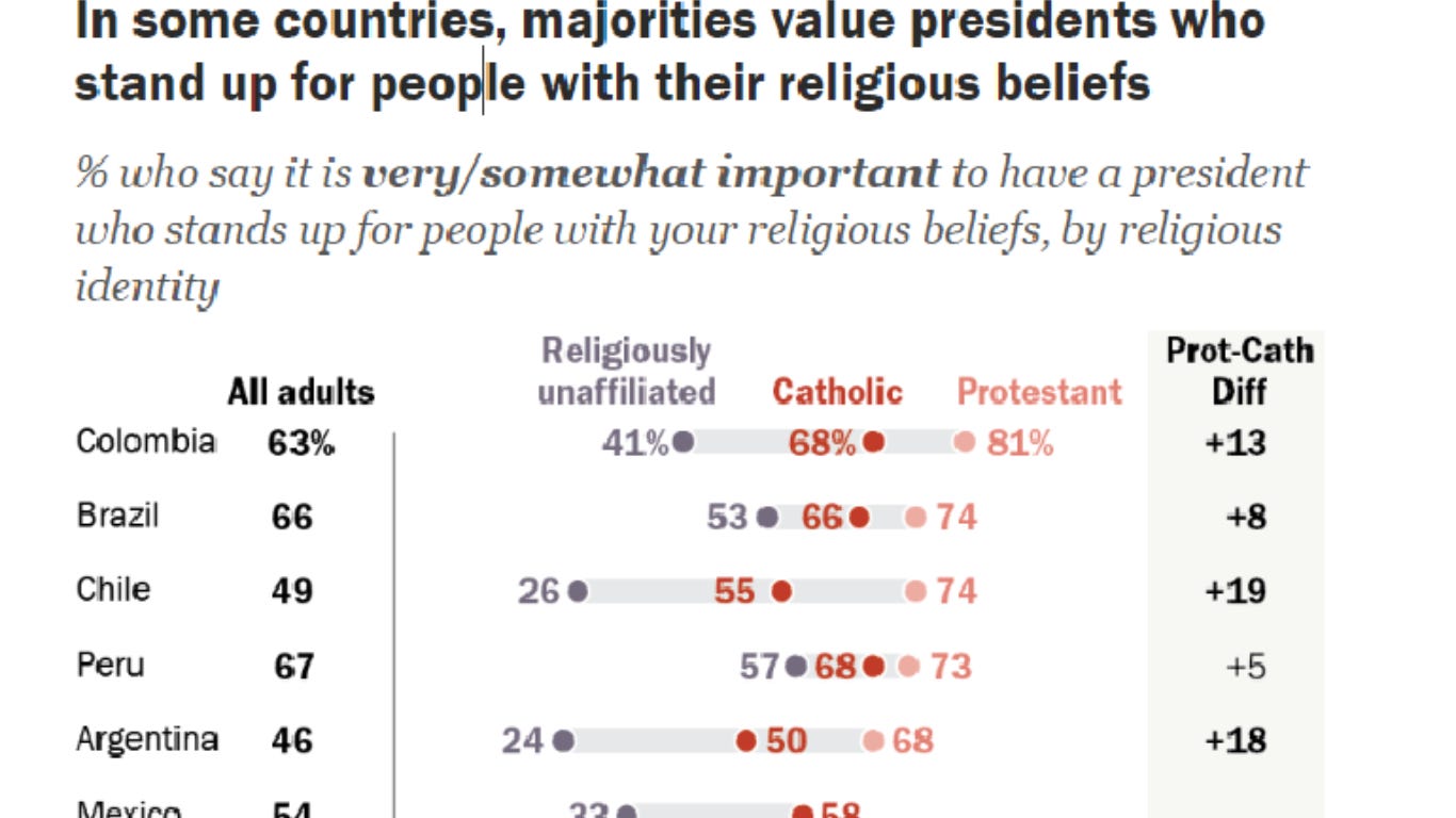 Pew encontró que en Brasil, Colombia y Perú alrededor de dos tercios de los adultos consideran importante tener un presidente que defienda a personas con sus creencias religiosas. En esos mismos tres países, mayorías también dicen que ser cristiano es importante para ser verdaderamente parte de la nación, y aproximadamente dos tercios afirman que la Biblia debería tener una influencia considerable en las leyes del país.